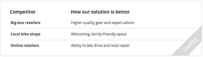 If you plan on advertising, talk about your messaging. What is the unique value proposition or selling point — your pitch — that you expect to resonate with potential customers? Talk about how that pitch positions you relative to your competitors. Are you the no-frills, low-cost option for budget-conscious shoppers? Or a premium product that is superior to the others in a key way? Or are you differentiating yourself in another way — being faster, more convenient, better for the environment, locally sourced? Make sure this is aligned with the competitive advantages that you described in the Competition section.